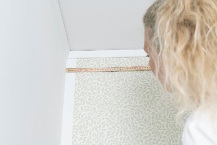 Vik den klippta tapetvåden dubbel på tapetbordet för att underlätta skärningen. Mät ut det största måttet på våden och lägg till en centimeter för att tapeten ska nå runt hörnet. Gör en markering på tapeten.