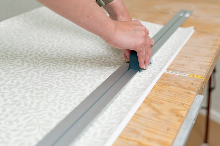 Skär till våden som ska överlappa hörnet med tapetkloss och tapetlinjal. Spara delen som blir över till nästa moment.
